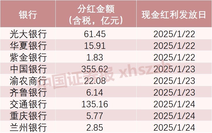Wind数据显示,1月22日至1月24日,共有光大银行、华夏银行、紫金银行、中国银行、渝农商行、齐鲁银行、交通银行、重庆银行、兰州银行进行分红派息。
